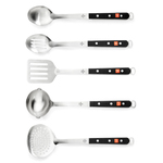 5pc Kitchen Tool Set Kitchen tool set for versatile cooking in your homeEasy care non-reactive stainless steelStain-free steel is strong and durable without the heavy weightHeat-resistant high density POM handlesBalanced and comfortable designHandles feature rings on the end for storage hanging14â Skimmer14â Slotted spoon14â Spoon14â Slotted spatula14â LadleDishwasher safe but recommend hand wash for ... |
