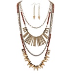 This can't-miss power set makes an unforgettable statement with endless tiers of metallic chains, golden fringe, round maroon and brown lucite beads and golden spike accents. It's a fashion-forward look for women who know style. It all comes together with an adjustable, elongated-link chain and matching 2 3/4" golden drop earrings, each adorned with a spike at the end. Crafted in antiqued yellow gold tone. " - .5" length.Piece 1: NecklaceMetal: GoldtoneFi ... |