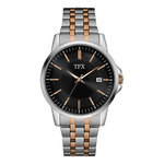 TFX by Bulova Mens Two-Tone Stainless Steel Watch Black Dial Stainless steel bracelet with two rose-gold tone tracksBlack sunray dial with rose-gold tone stick indicesDate window by the 3 oâclock markFeatures rose-gold tone hour minute and seconds handMinute markers along outer rimRose-gold tone accent crownMineral glass dial windowFold over closureCase diameter: 40mmWater resistant to 30 M ... |