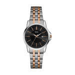 TFX by Bulova Ladies Two-Tone Stainless Steel Watch Black Dial Stainless steel bracelet with two rose-gold tone tracksBlack sunray dial with rose-gold tone stick indicesDate window by the 3 oâclock markFeatures rose-gold tone hour minute and seconds handMinute markers along outer rimRose-gold tone accent crownMineral glass dial windowFold over closureCase diameter: 30mmWater resistant to 30 M ... |