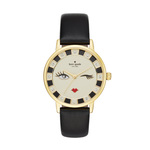 Ladies Crystal Wink Metro Black Strap Watch Wink Face Dial Cheeky Kate Spade watch with black leather bandCream colored dial with crystal indexes black novelty accentsDial features winky face with crystal eyeStainless steel gold-tone case and gold-tone handsTraditional gold-tone buckle closureMineral crystal dial windowCase diameter: 34mmCase thickness: 8mmWater resistant to 30 M ... |