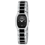This sporty Citizen Eco-Drive is the perfect choice to see you through a busy day of errands, meetings, and even a casual dinner out. Silver-tone stainless steel bracelet and case, 25mm. Black dial features luminous hands and box hour markers, date indicator and logo. Eco-Drive E011 movement. Splash resistant.